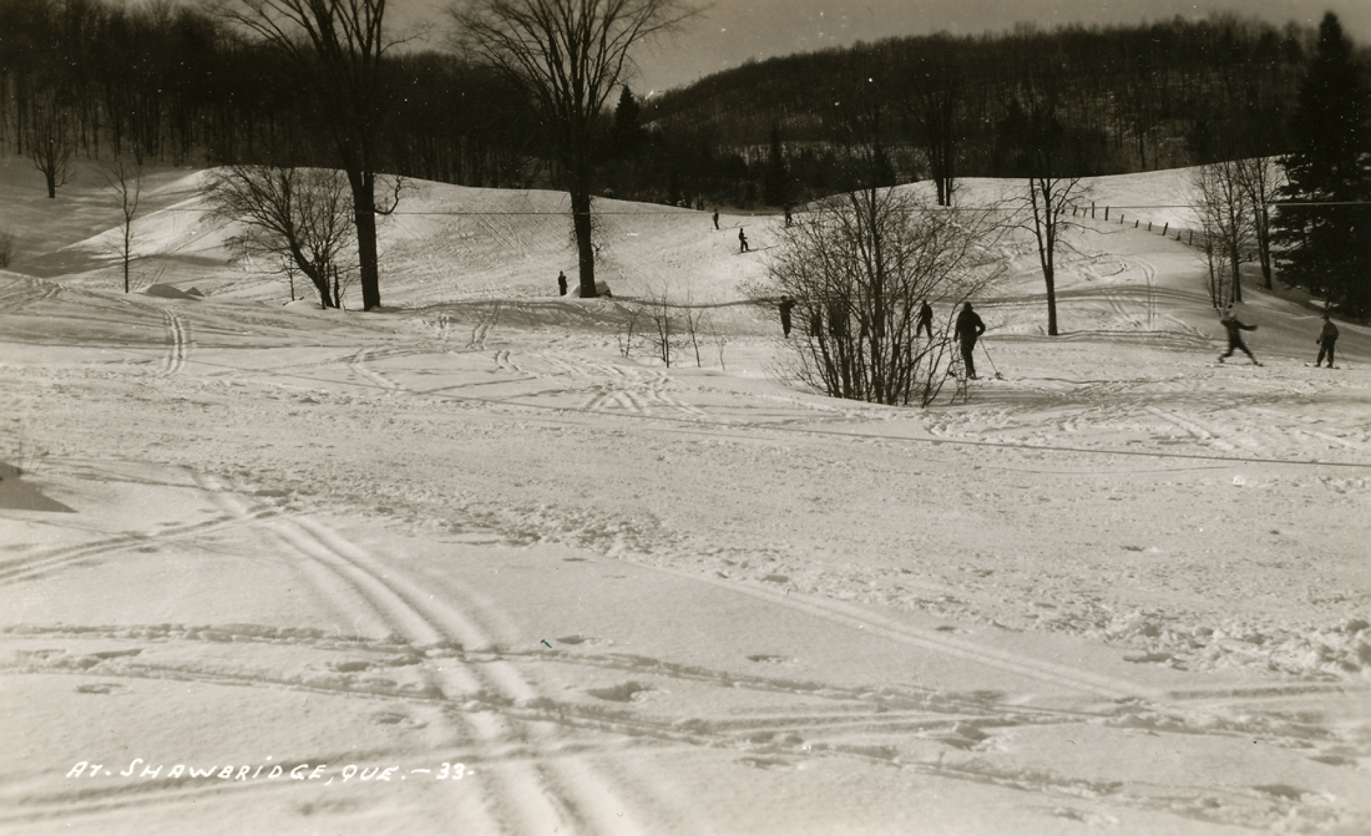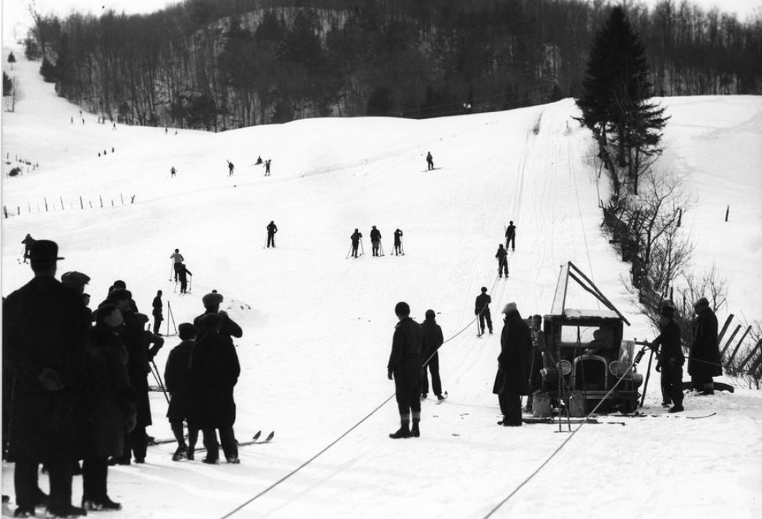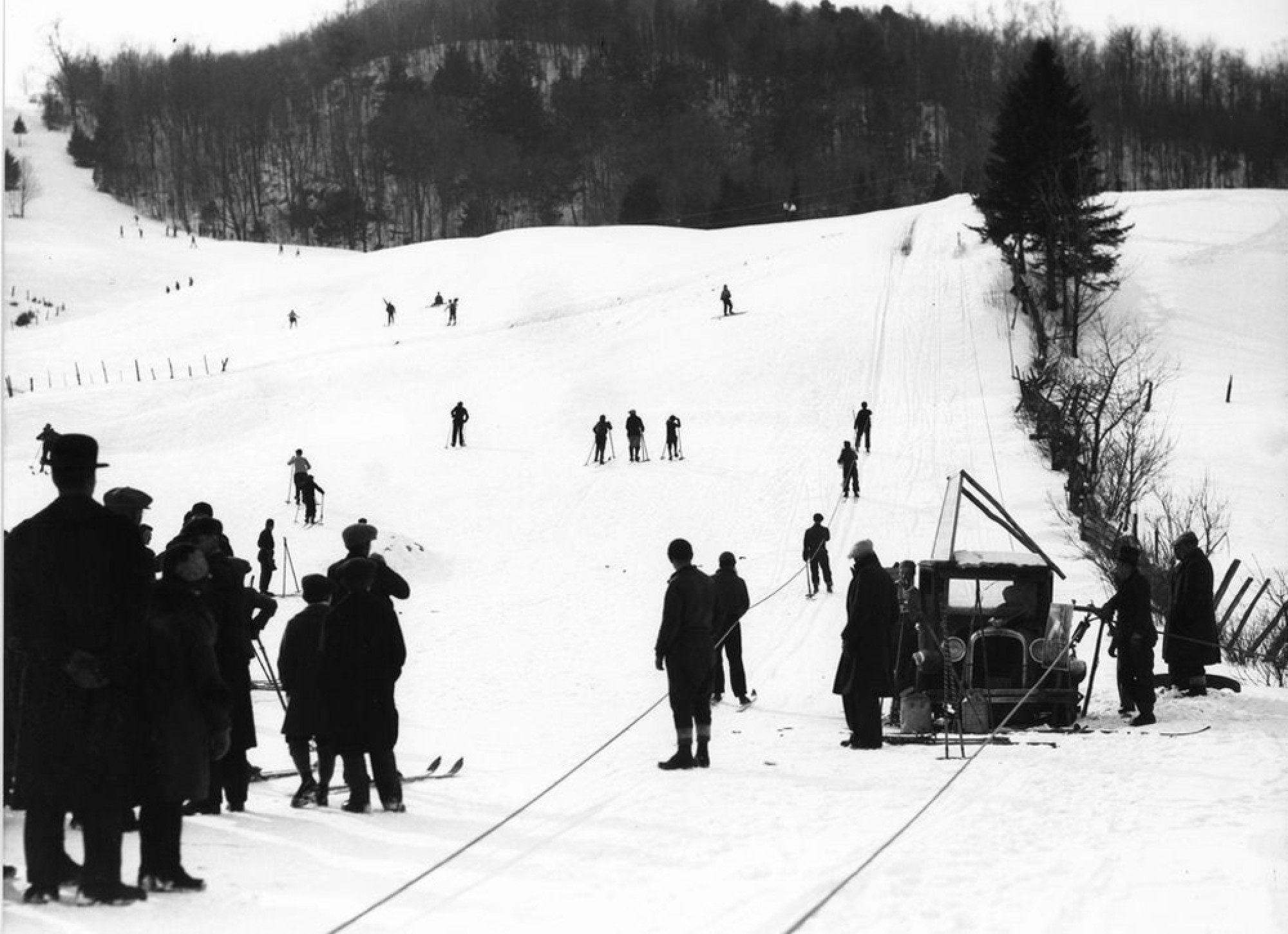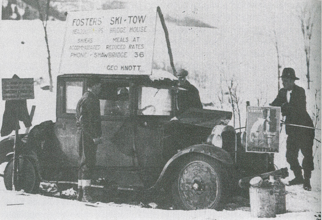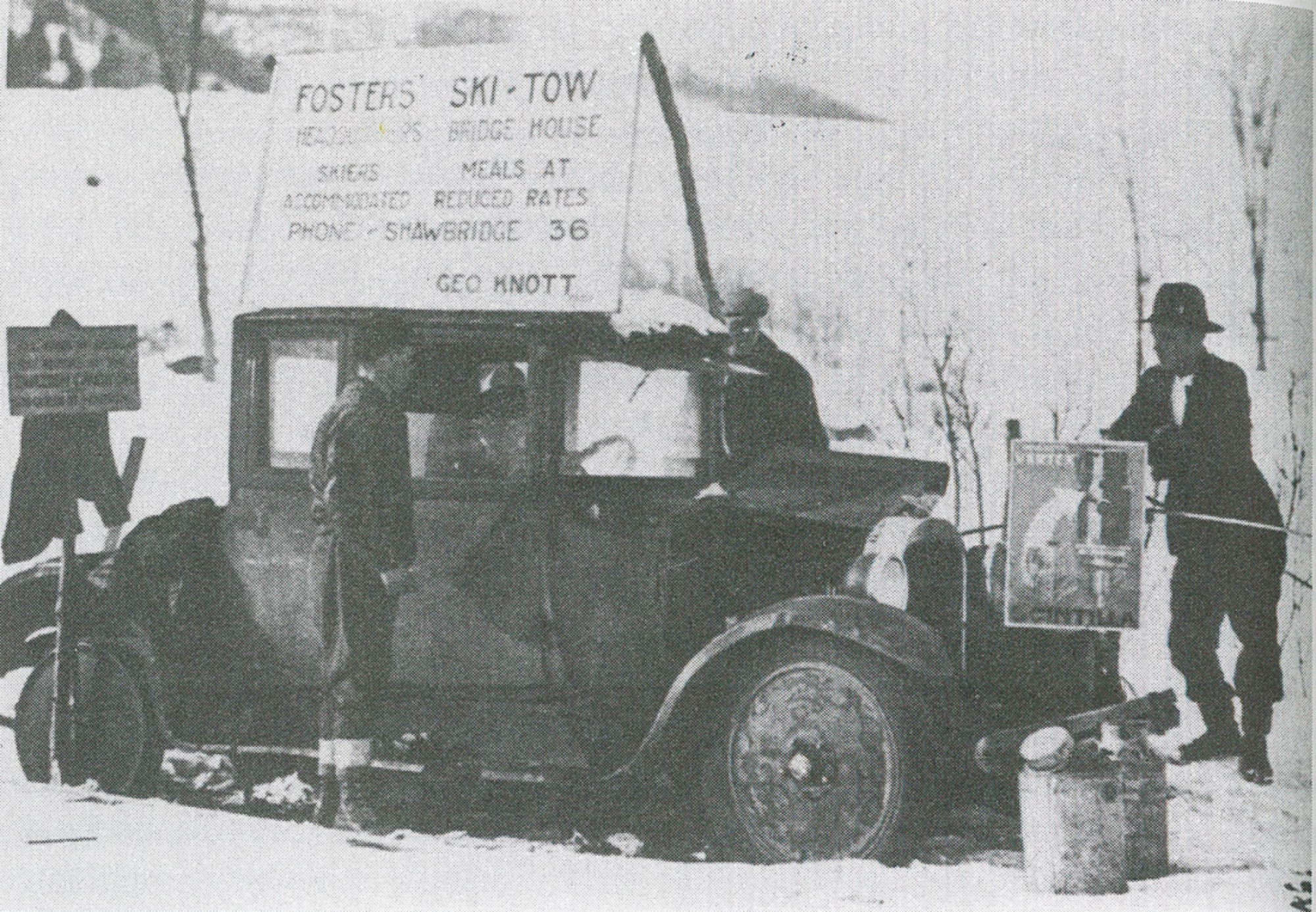 En 1933, Alex Foster installe une voiture taxi comme remonte-pente temporaire sur la terre de Ménassippe Richer, voisin de la terre de Gordon Shaw. Les installations sont d’abord minimes, pas du tout semblables aux chalets et aux chaises confortables des stations de ski actuelles. Sur les photographies, il est possible de remarquer la crispation des skieurs agrippant le câble toujours mouillé et vrillant, de telle sorte qu’il use immanquablement les mitaines ou, pire encore, enroule les foulards au risque d’étrangler l’utilisateur.